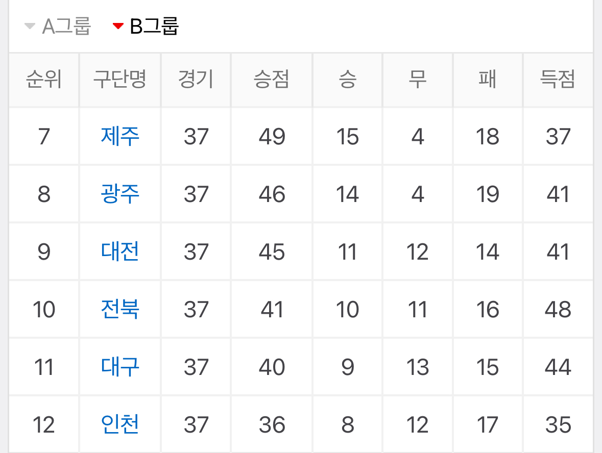 지난 라운드가 끝이 난 후 제주 유나이티드가 광주 FC의 7위를 탈환해 순위가 바뀐 상황이었습니다.
