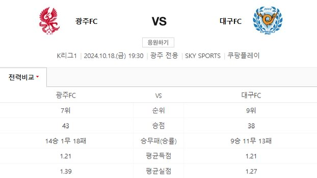 광주 전용구장에서 펼쳐지는 7위 광주 FC와 9위 대구 FC의 경기입니다.