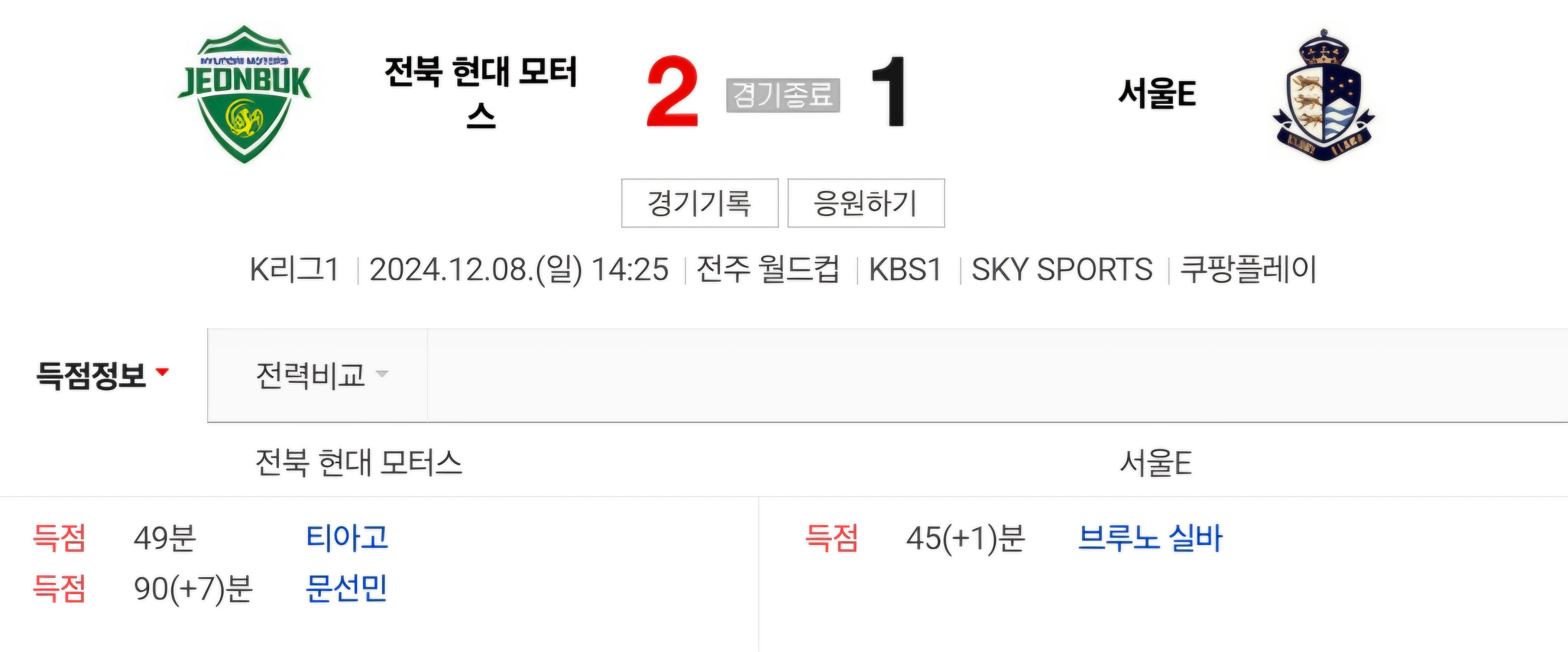 결국 경기는 2차전 2대 1, 합산 스코어 4대 2로 전북 현대 모터스가 승리하며 K리그1 잔류에 성공하였습니다.