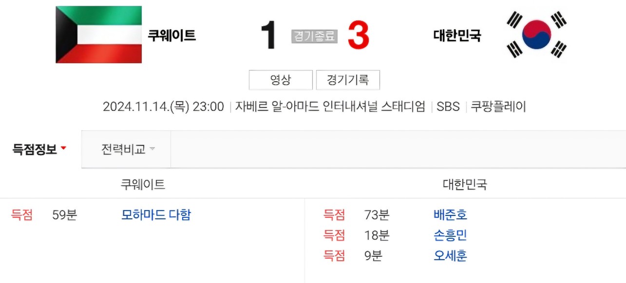 이후에도 한국과 쿠웨이트의 공방이 이어졌지만 안정적인 경기력으로 3대 1로 마무리했고,