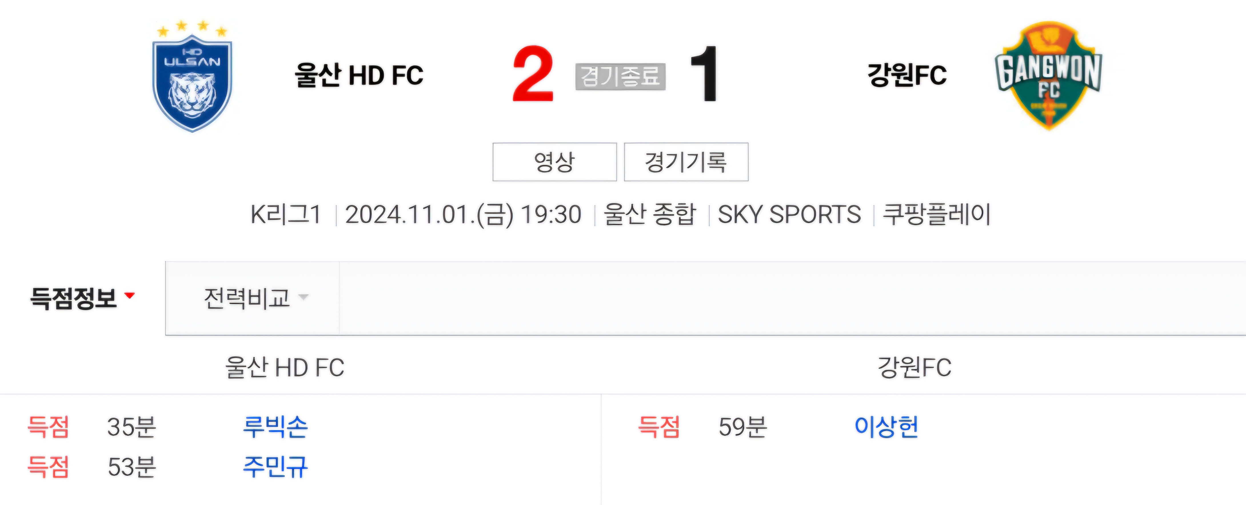 1위 울산 HD FC와 2위 강원 FC의 경기가 있었습니다.