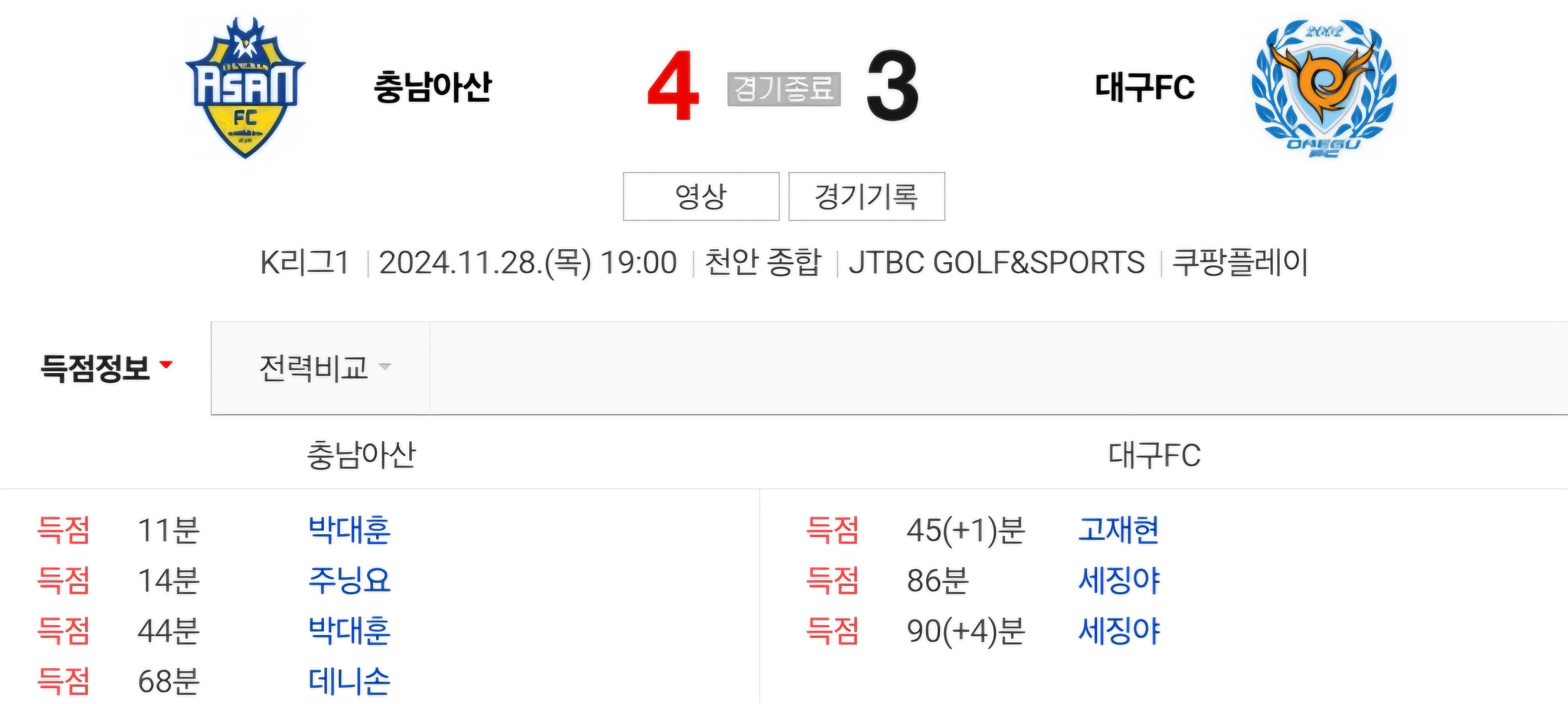천안 종합 경기장에서 펼쳐진 K리그 2 2위 충남아산프로축구단과 K리그 1 11위 대구 FC의 경기가 있었습니다.