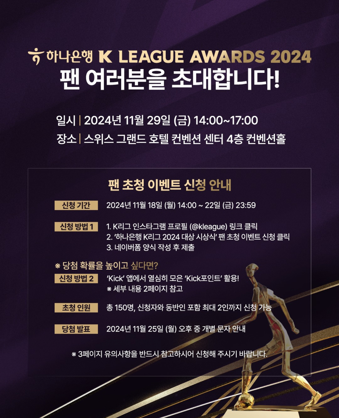 2024 K리그 어워즈는 11월 29일(금) 오후 2시
